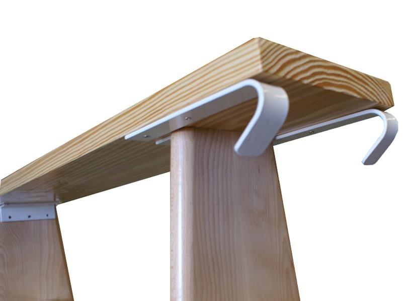 Banco sueco fabricado en madera de pino melis (tabla superior) y madera de haya (patas).Está provisto de refuerzos metálicos entre patas, de gancho metálico... Saber más