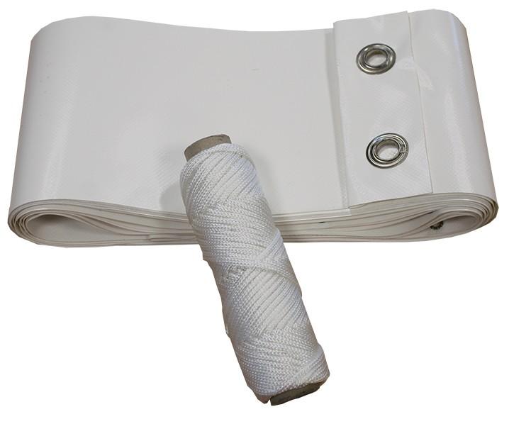 Repuesto cinta pádel. Cada repuesto cuenta con una medida de ancho de 7,5cm por cada lado; 15cm en total y 10,15m de largo.Incluye 2 ollados en cada extremo y 35 ojetes por cada lado, 70 en total.Los ojetes son agujeros horizontales que lleva la red todo a lo largo para que por ellos pase el hilo (incluido en el repuesto) para sujetar la cinta a la red.
