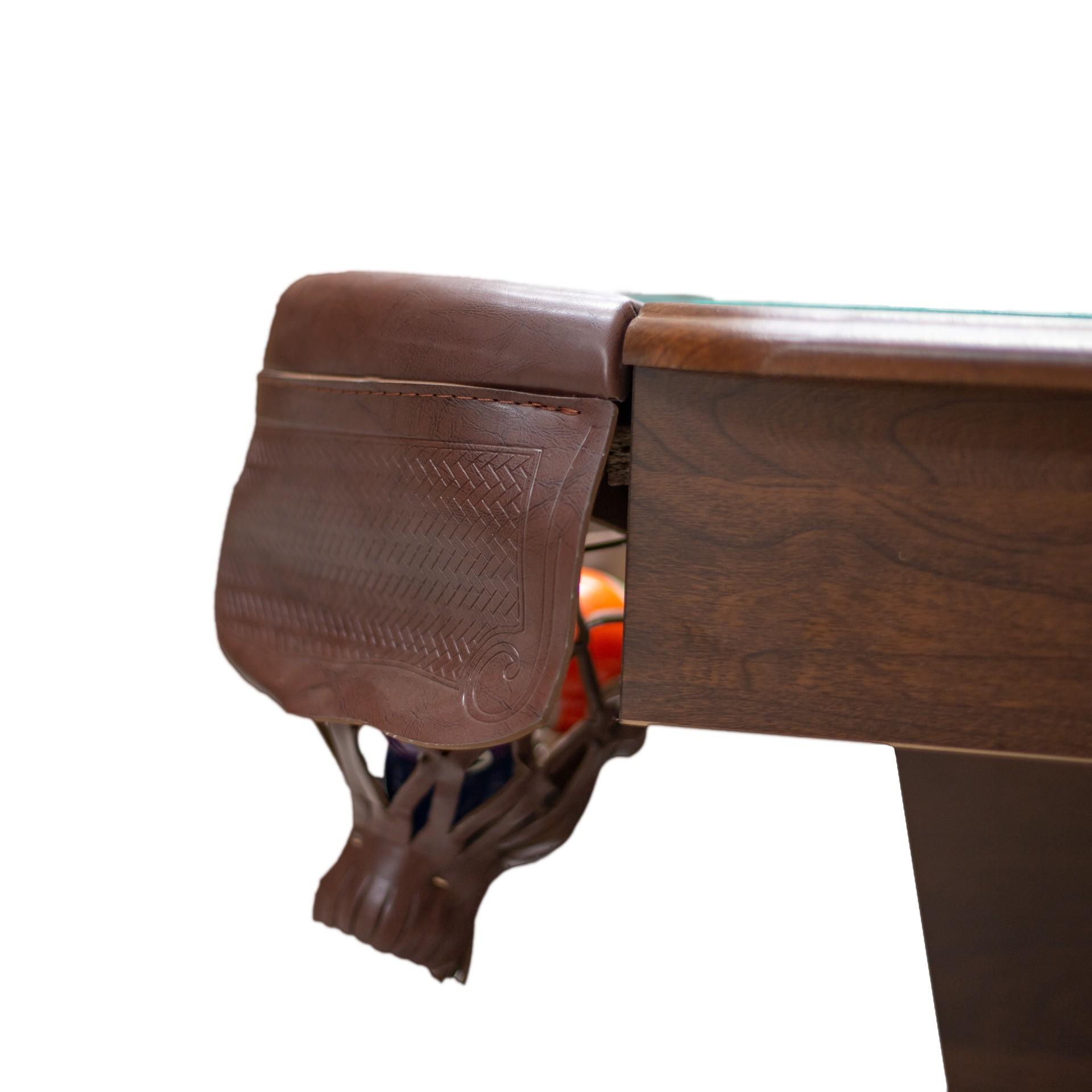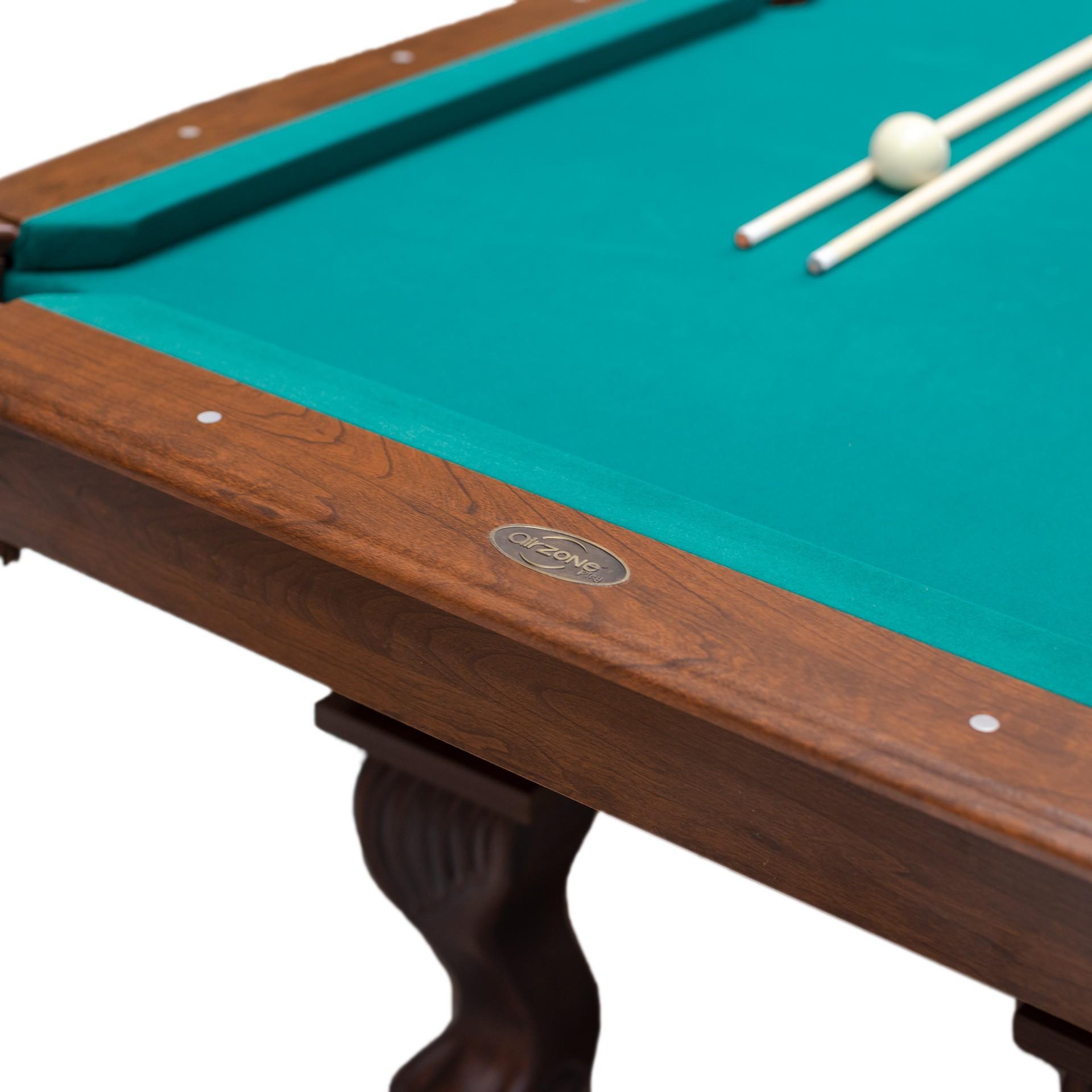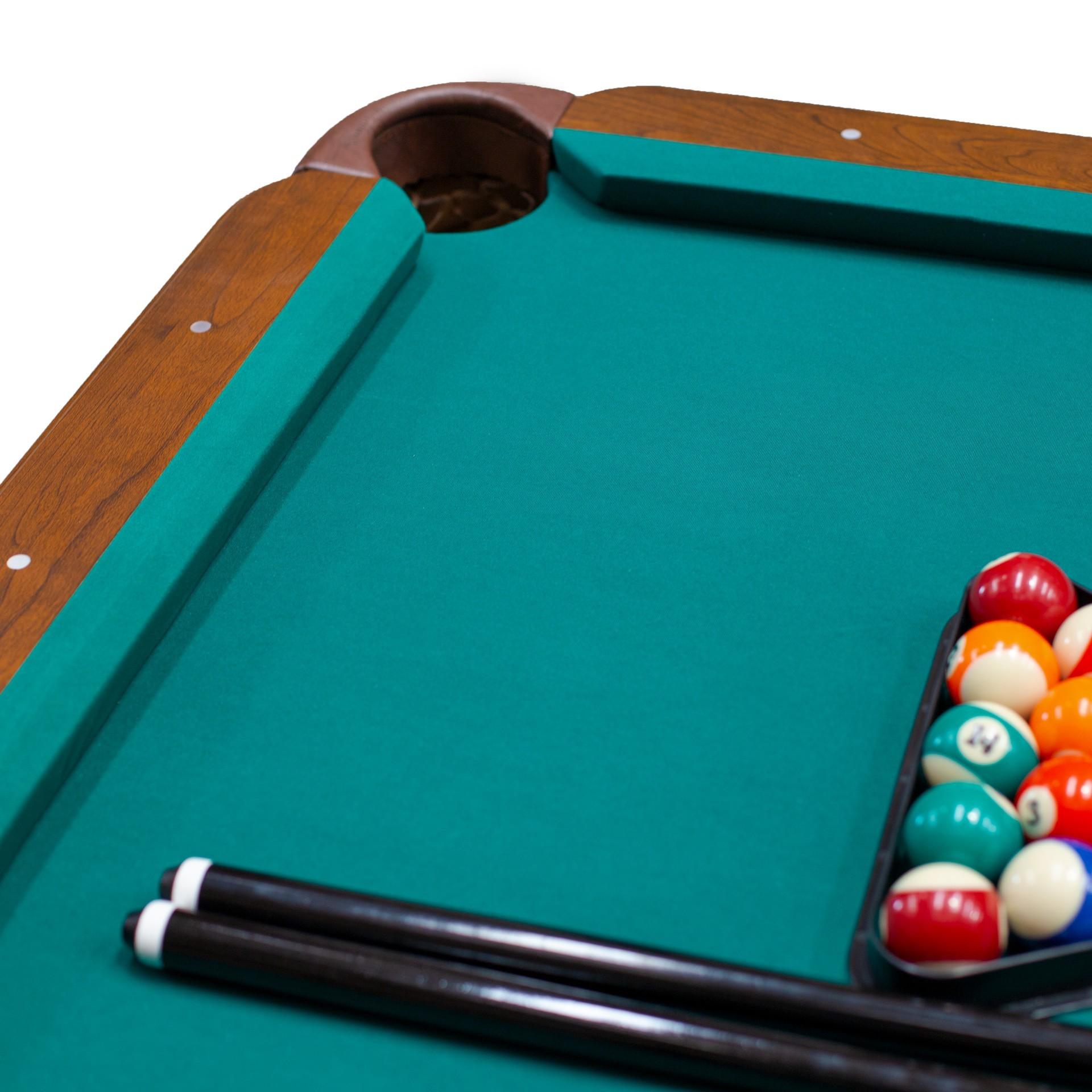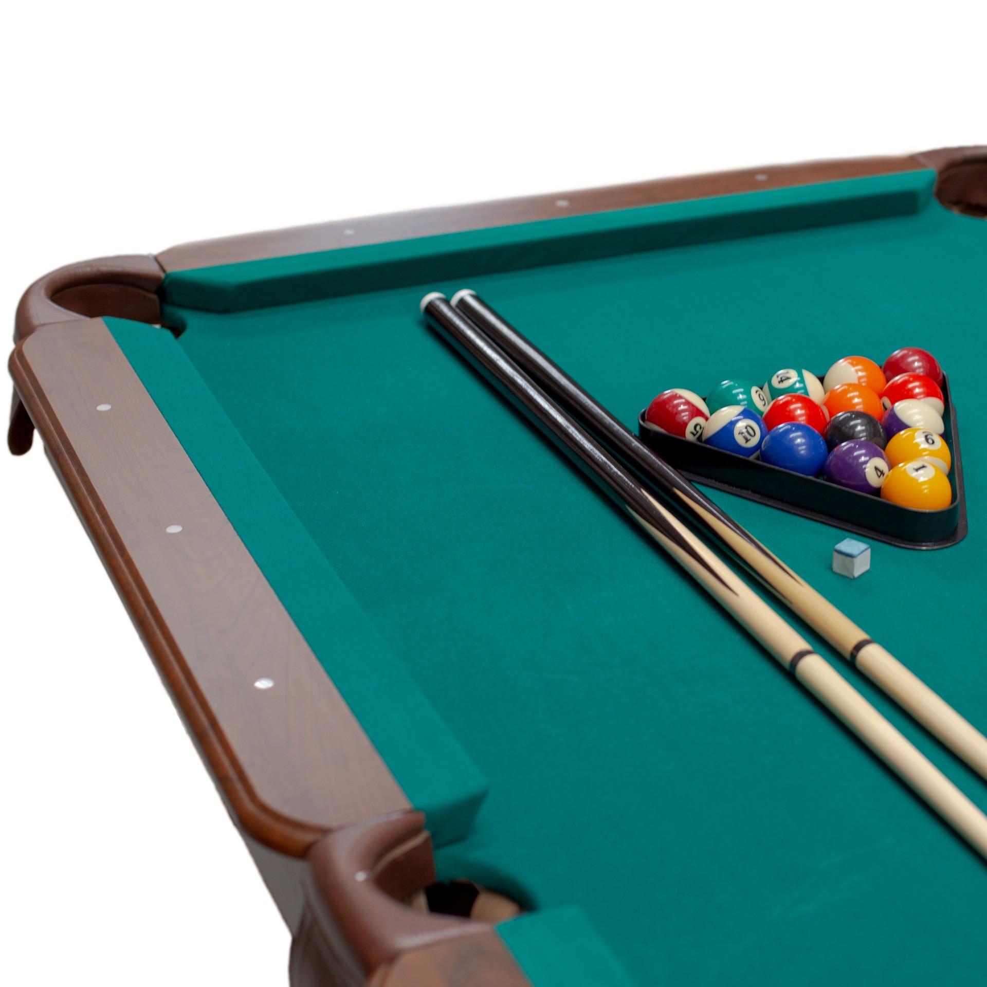 Superficie de juego: PB (tablero aglomerado). Delanteros: MDF (tipo de madera formado por fibras de la misma unidas a resisan y comprimidas por presión y calor) de 12,7mm de ancho. Bolsillos de PU (cuero sintético de las troneras en donde caen las bolas).Incluye dos tacos y un juego de bolas de billas de 2,1/4 diámetro así como triángulo y dos tizas.Dimensiones de la mesa: 221x125x78,7cm.Dimensiones del campo de juego: 191,8x95,9cm.Packaging: 2 bultos. 1º bulto de 48x53x48cm - 16kg - 2º bulto de 230x138x15cm - 93kg.
