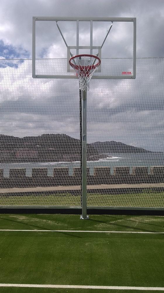 Canastas de sección redonda para empotrar al suelo mediante una base de anclaje (incluida). Ideal para pistas deportivas de exterior. Vuelo canastas: Baloncesto: 1,65 mts - Minibasket: 1 mt. Contiene doble sistema de tuercas de nivelación, tanto en soporte de tablero como en base de anclaje, incorpora también dos tirantes superiores de estabilización a las esquinas del soporte del tablero. Consulte las diferentes variedades de accesorios que permite, como aros, tableros, redes, protecciones varias, etc. Acabado galvanizado gris. El material metálico que forma parte de la canasta lleva un proceso de galvanizado en caliente por inmersión que protege el hierro de la oxidación al exponerse ante una alta corrosión (ideal para zonas costeras)