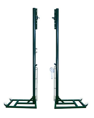 Juego de postes fabricados en acero de sección redonda de 80mm.Diseñados para anclar a una base con ruedas que permite la colocación de un contrapeso que evite su vuelco.Incluye carraca para poder tensar el cable de la red que se quiera colocar. En la parte superior llevan el sistema regulador de altura de red, que permite jugar a voleibol en sus distintas categorías. Por último, la parte inferior está provista de los correspondientes enganches para la práctica de tenis.Se fabrica bajo pedido.