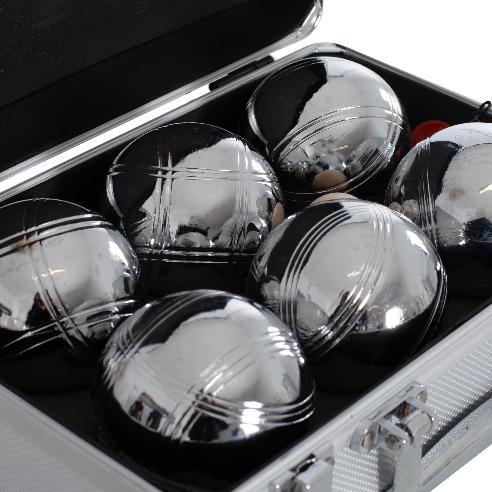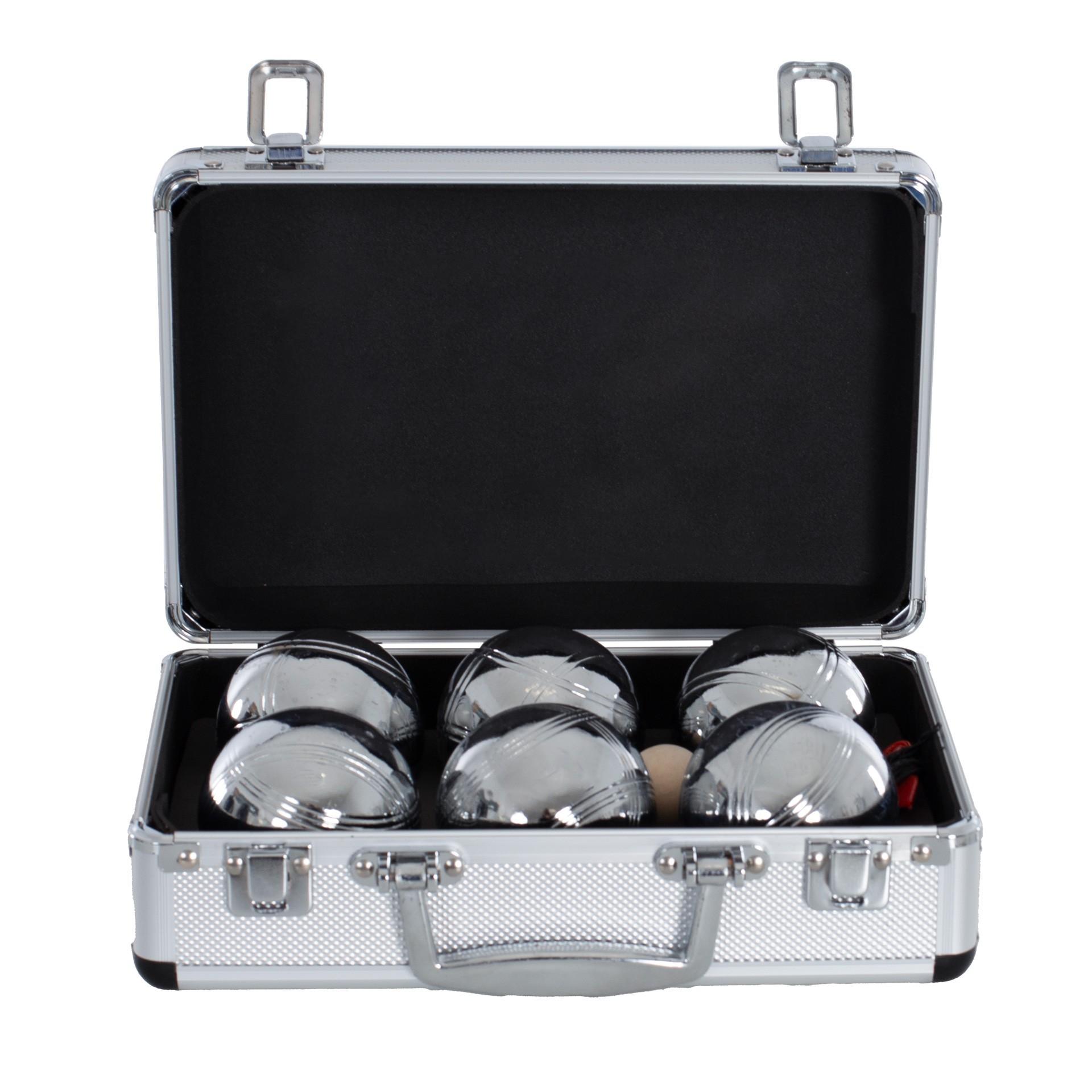 Juega a la petanca y trabaja tu precisión en cualquier lugar y momento.Compuesto por 6 bolas de acero cromado (3 bolas de 2 líneas y 3 bolas de 3 líneas) y un boliche. De cómodo agarre.Fácil almacenaje y transporte gracias a su maletín de 27x20x10cm.Diámetro de la bola: 7cm aprox. Peso: 700g.