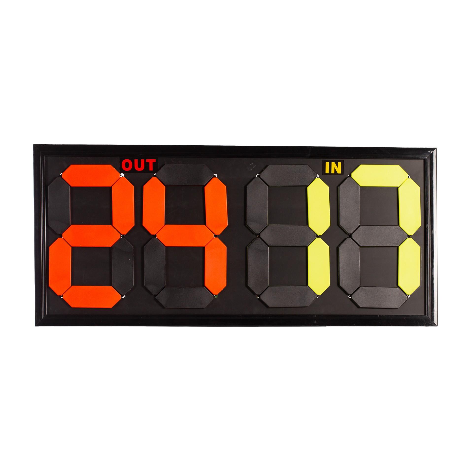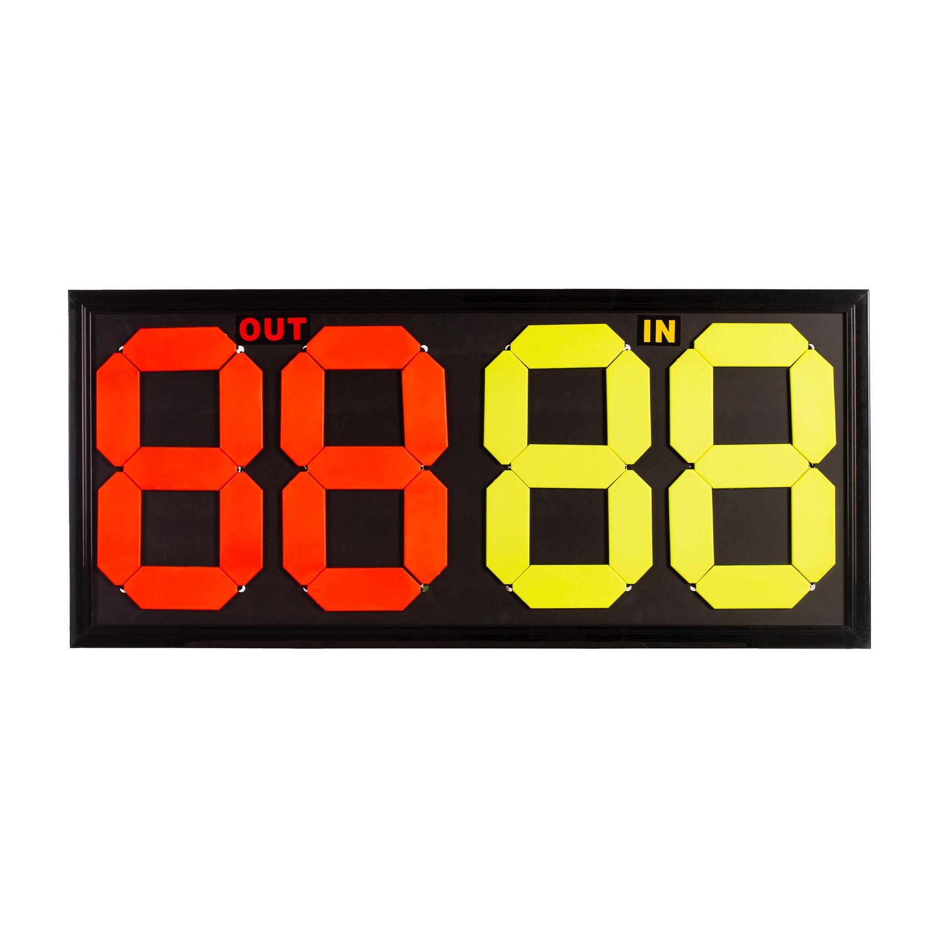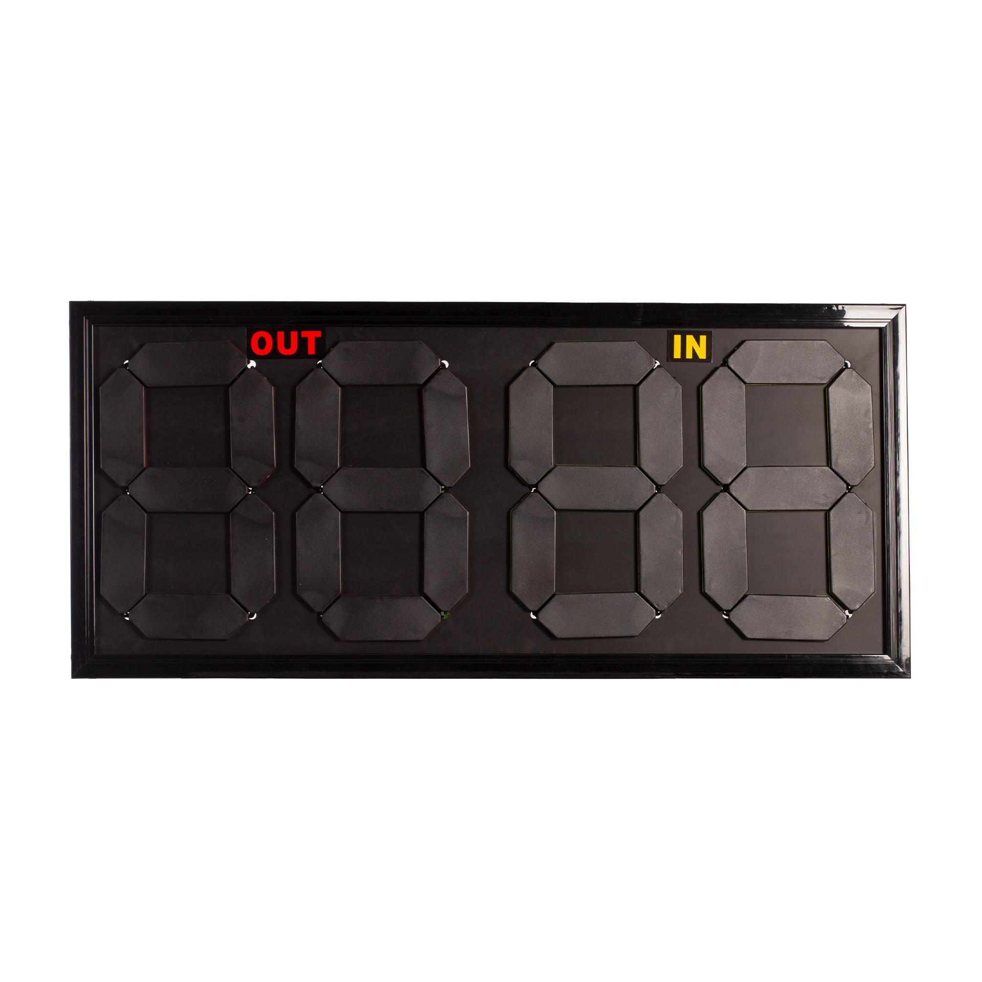 Marcador de cambios (entrada y salida) doble cara. Cuenta con 4 dígitos que se forman con placas reversibles. Numeración del 0 al 99. Medidas: 84x38,5x2cm. Saber más