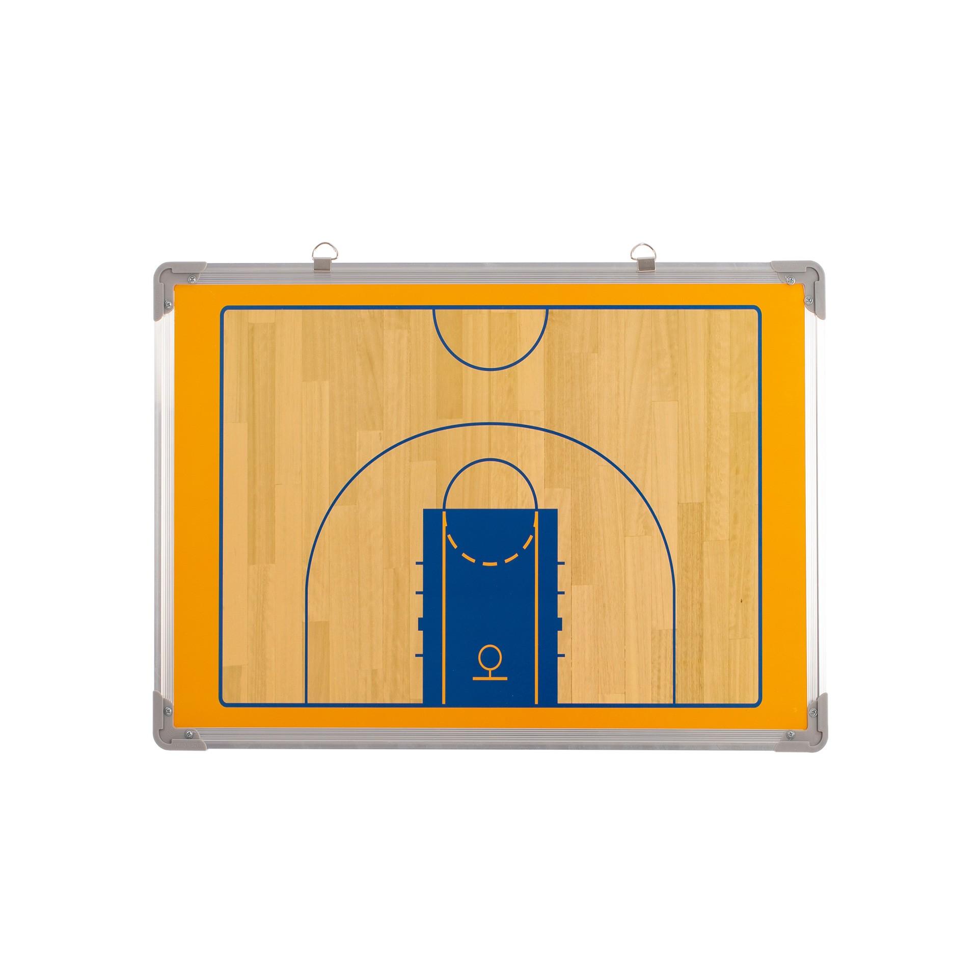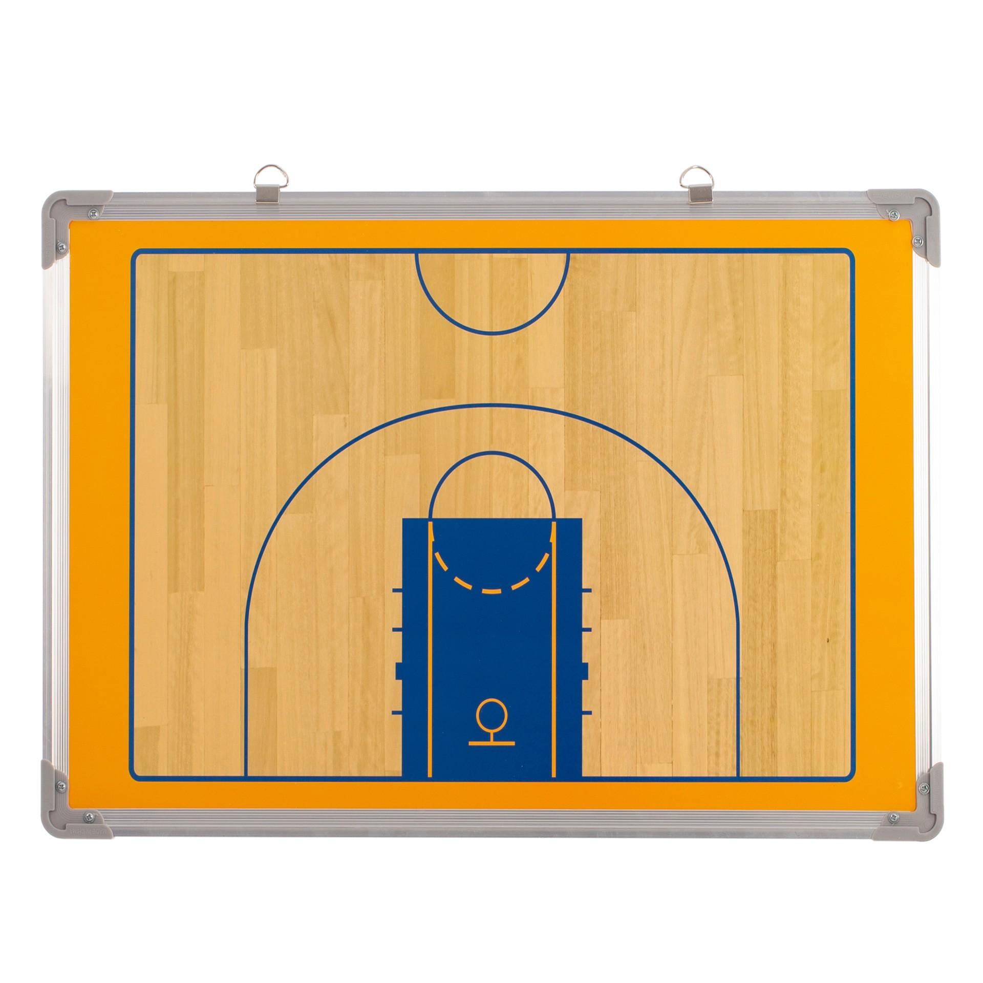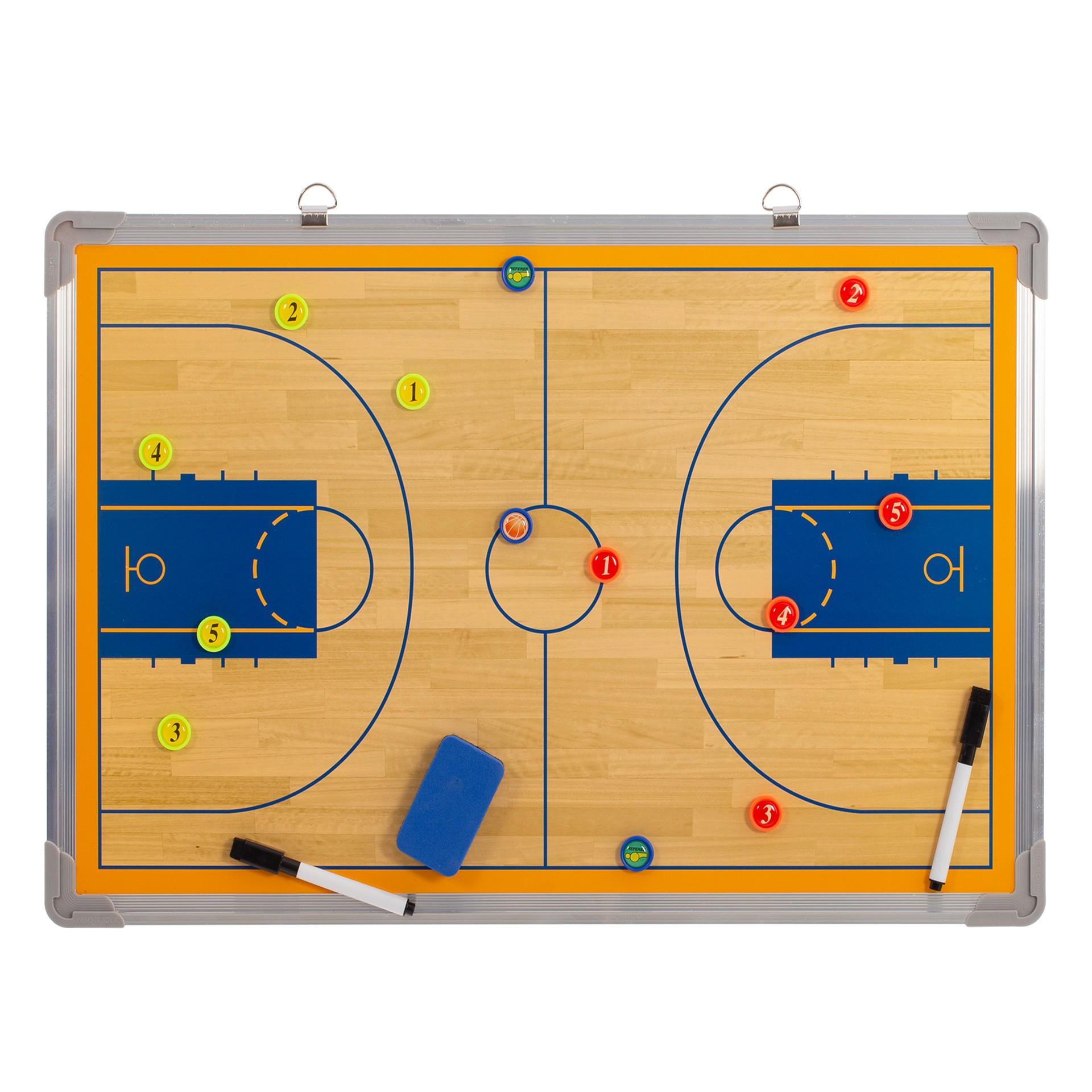 Pizarra cerco de aluminio y diseño de cancha de basket perfecta para el diseño de tácticas y planificaciones de juego. Reversible y magnética. En uno de los lados incluye cancha completa y en el otro medio campo. Incluye fichas magnéticas numeradas, rotulador y borrador. Cuenta con dos anillas para facilitar su colocación. Cantos protegidos.