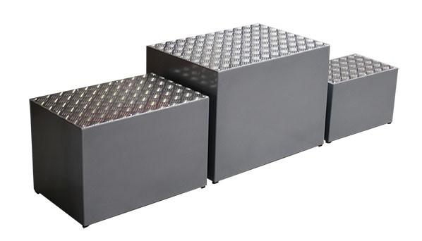 Podium de estructura metálica con chapa superior antideslizante. Provisto también de chapa metálica frontolateral con la posibilidad de personalización. Medidas de cada pieza: 70x50x50cm/60x40x40cm/ 50x30x30cm. Consulta fabricación de otras medidas. Producción bajo pedido.Medidas del packaging: 54,5x53x75cm. Peso: 43,5kg.